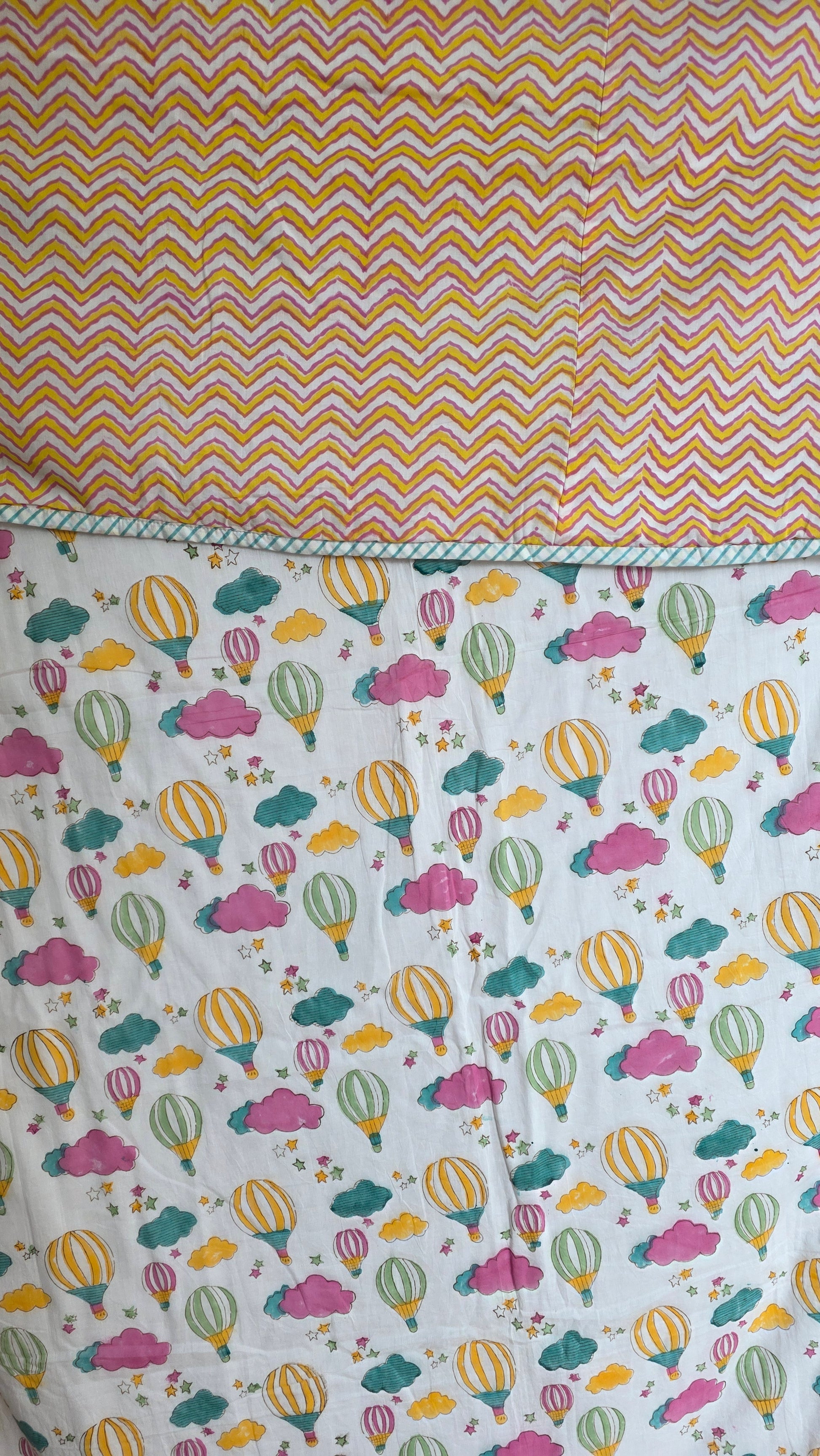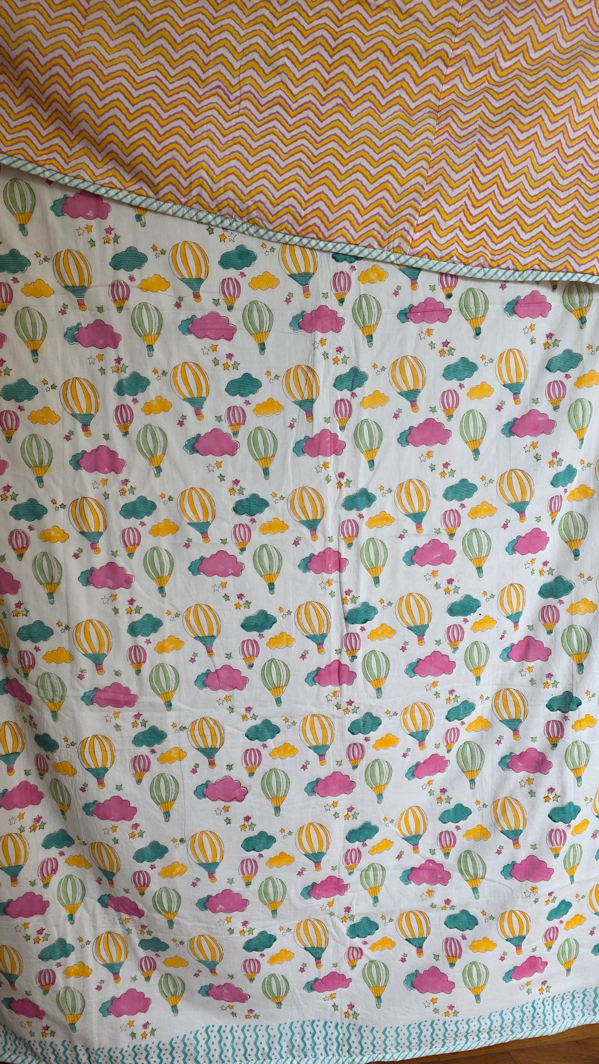 This adorable reversible dohar is made with pure mulmul cotton and features hand block prints in vibrant colors.