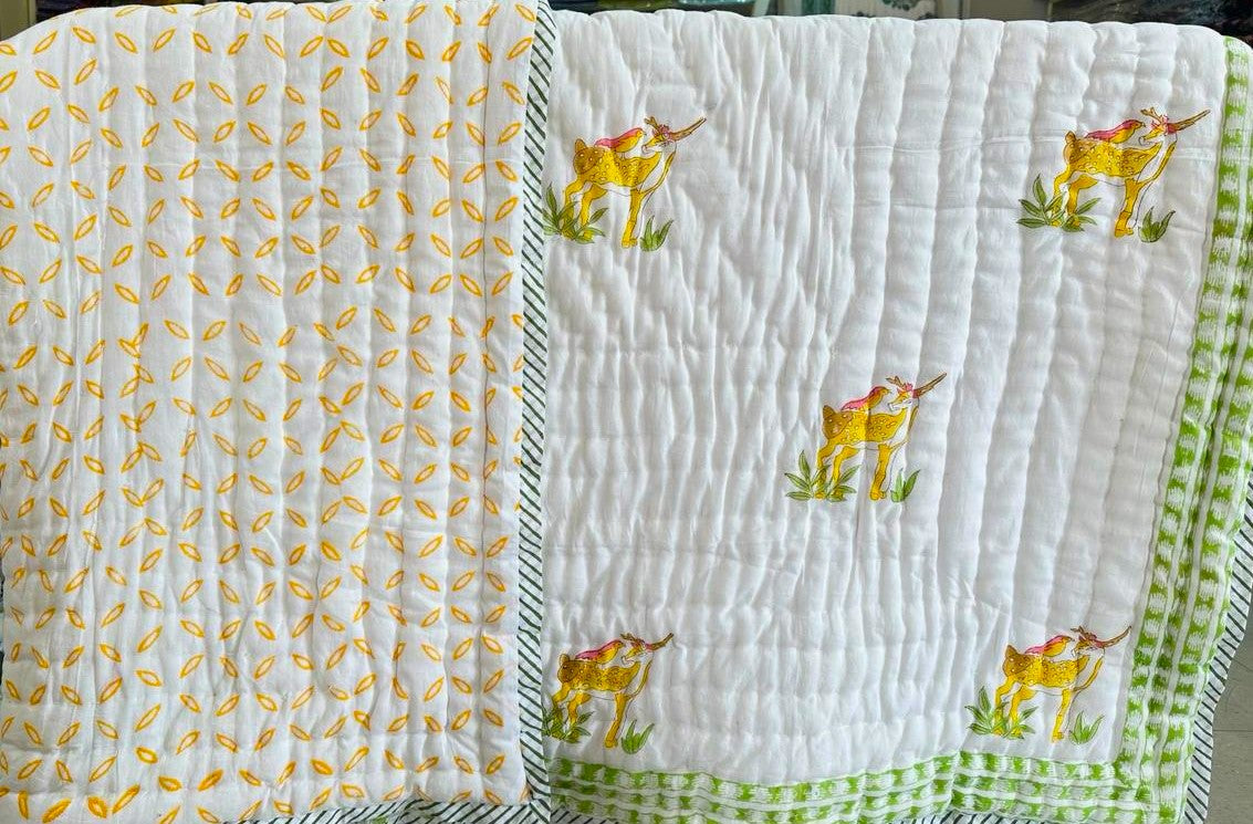This adorable reversible quilt/comforter is made with pure mulmul cotton and features hand block prints in vibrant colors.