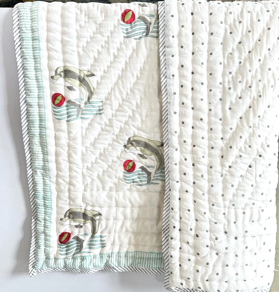 This adorable reversible quilt/comforter is made with pure mulmul cotton and features hand block prints in vibrant colors.