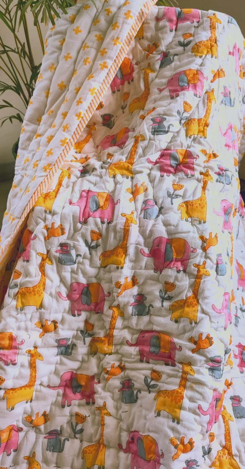This adorable reversible quilt/comforter is made with pure mulmul cotton and features hand block prints in vibrant colors.