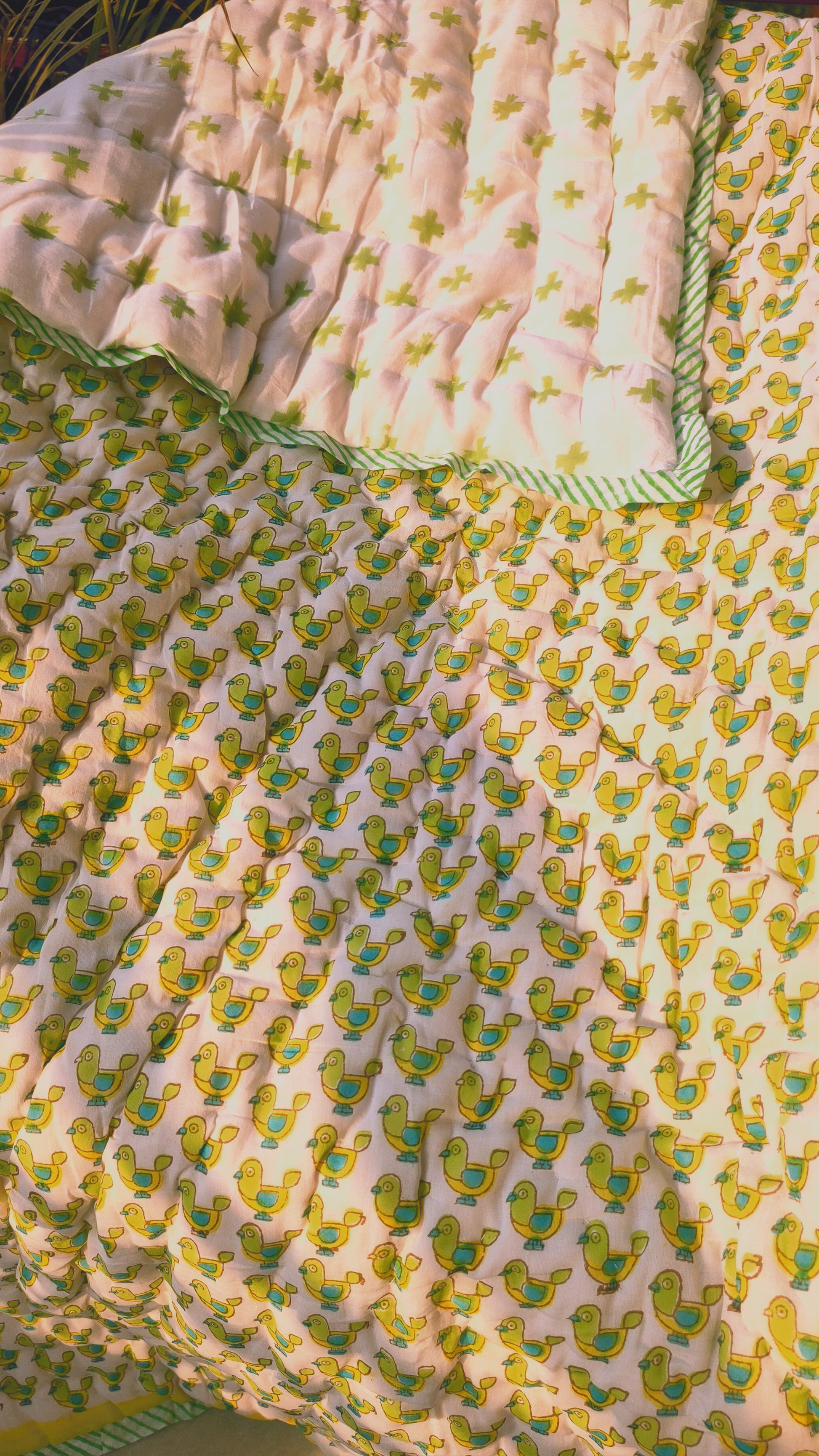 This adorable reversible quilt/comforter is made with pure mulmul cotton and features hand block prints in vibrant colors.