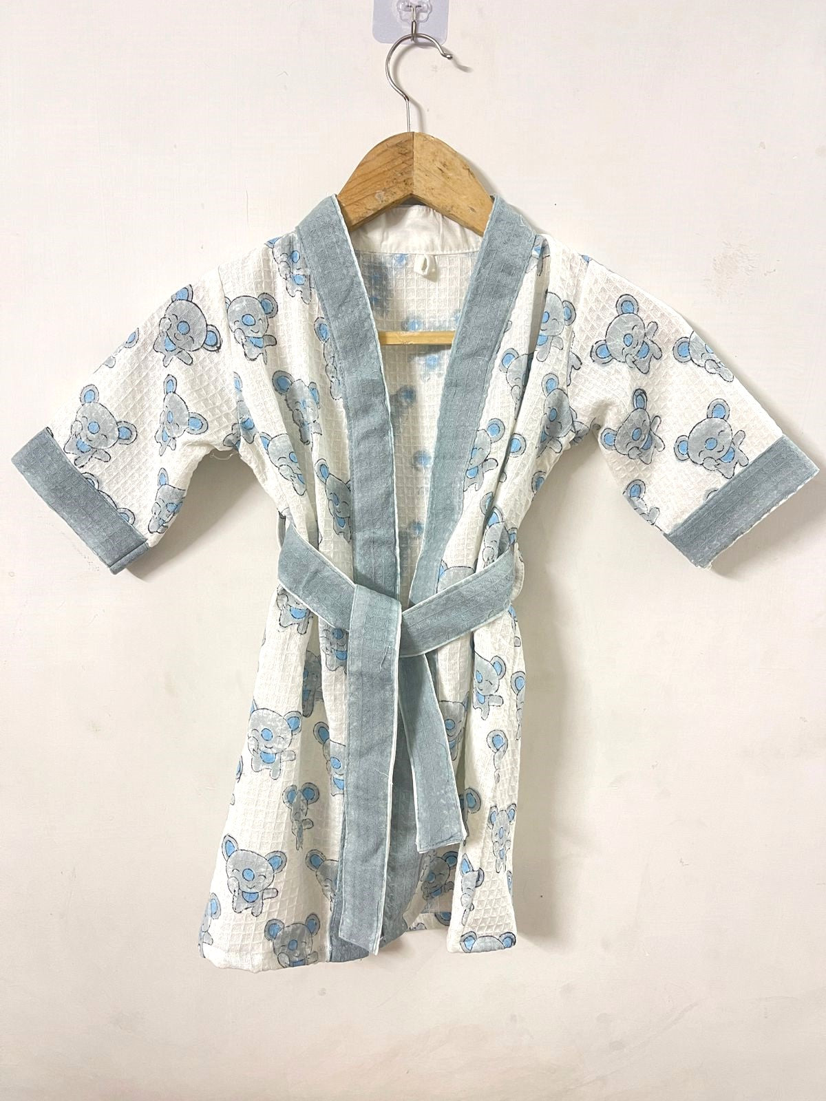 Our waffle cotton printed bathrobes, the perfect way to keep your kids warm and cozy after a bath.