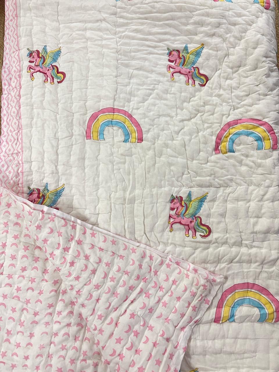 This adorable reversible quilt/comforter is made with pure mulmul cotton and features hand block prints in vibrant colors.